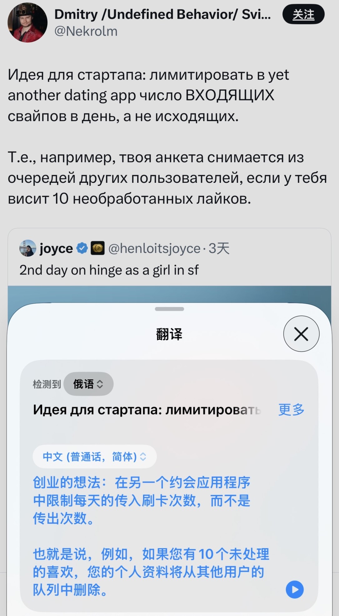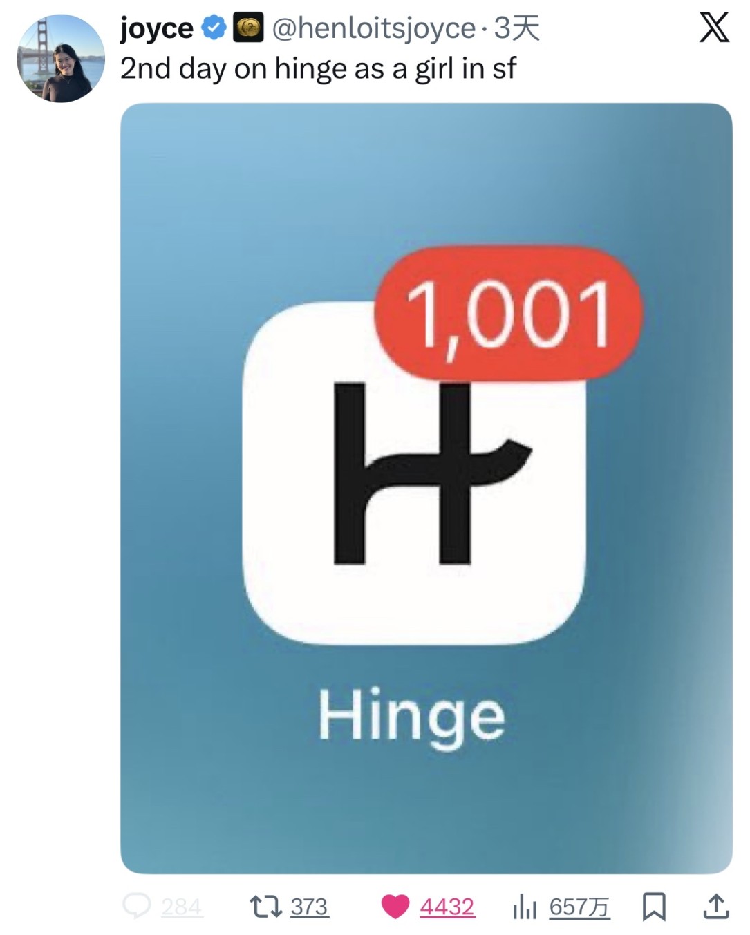 当地科技从业者 Joyce 在约会软件 Hinge 上注册女性账号,第二天就收到 1001 个赞,她将截图配上自嘲文案发到社交平台,浏览量迅速突破 600 万。