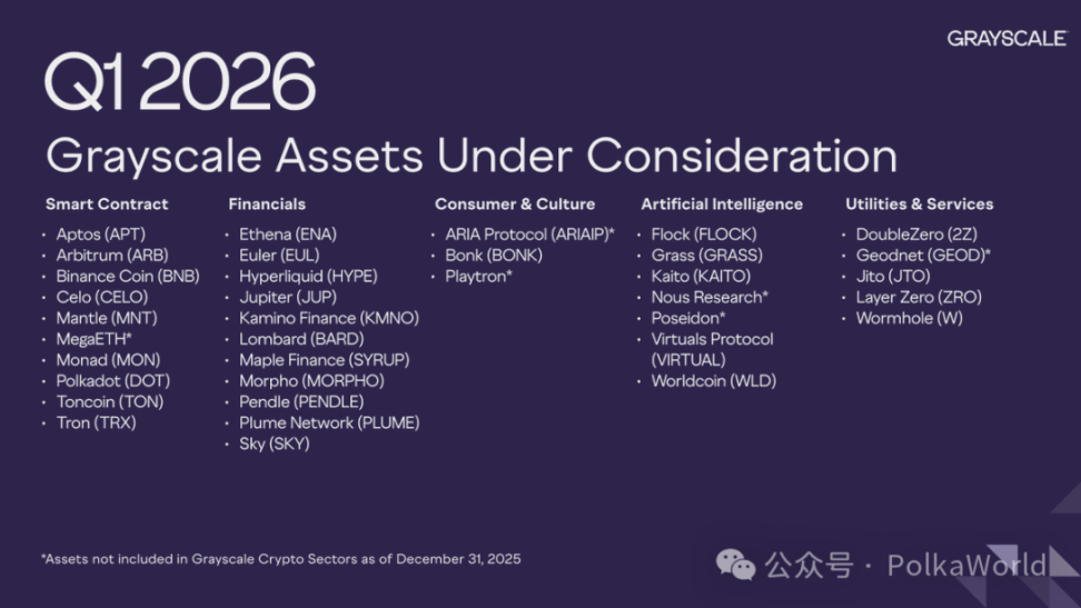 DOT 被列入 Grayscale(灰度)在 2026 Q1「正在考虑投资」的加密资产名单中!