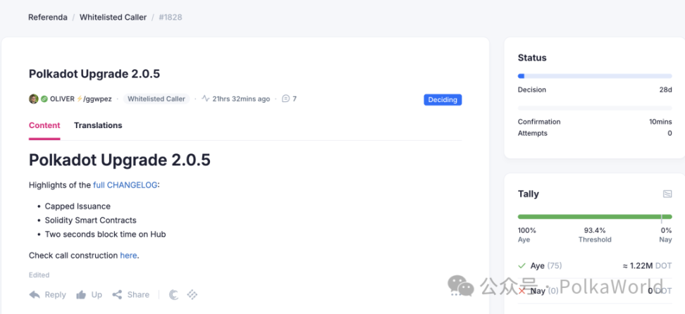 这意味着,1 月 27 日起,Polkadot Hub 将同时具备:合约能力 + ~2 秒出块!Polkadot Hub 将正式进入全面启动阶段!https://polkadot.subsquare.io/referenda/1828