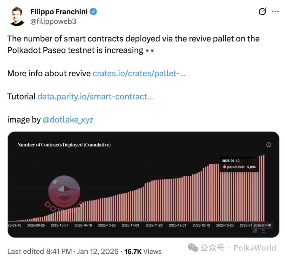 数据显示,通过 Revive pallet 在 Polkadot Paseo 测试网部署的智能合约数量正在稳步上升,反映出开发者对新一代智能合约执行环境的持续参与与测试热度提升。相关教程与工具链已逐步完善,为后续主网上线与生态应用落地打下基础。https://x.com/filippoweb3/status/2010693638649446871