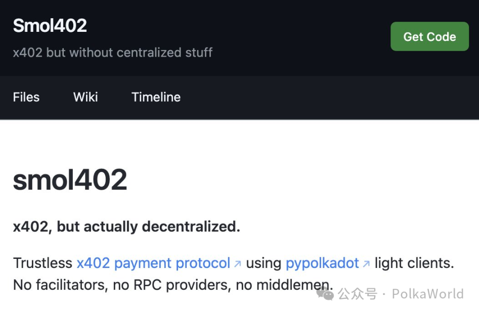 Parity 产品工程负责人 Karim 发布了一个完全去中心化的 x402 支付协议实现(smol402)。该方案通过内嵌 Polkadot 轻客户端 smoldot,让服务器直接与网络同步并自行验证支付,无需中介、RPC 提供商或 API Keys,显著降低信任依赖并提升抗审查性与安全性。https://x.com/polkaworld_pro/status/2011644214745124996