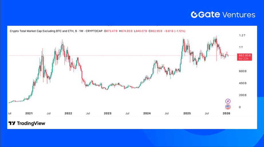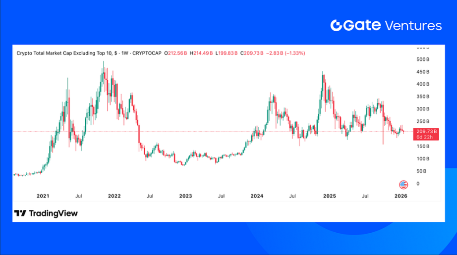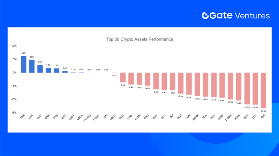 The total crypto market cap increased 2.24% last week, but gains were mainly driven by BTC and ETH. Excluding them, the market fell 0.75%, and the broader altcoin market excluding the top 10 dropped 2.32%, showing continued weakness across most alts.