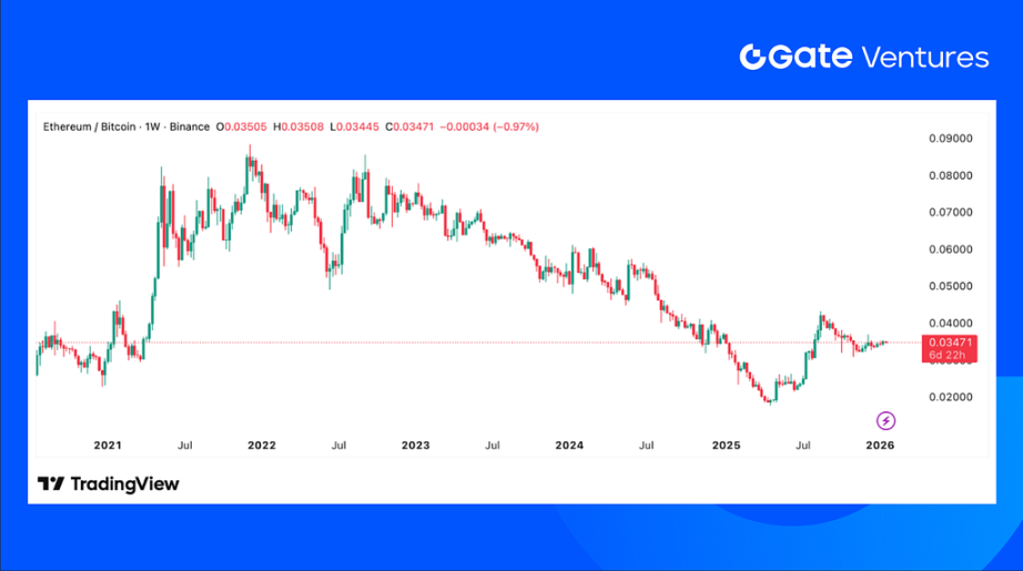 The ETH/BTC ratio increased 2.13% to 0.0346, showing slightly stronger performance from ETH. Market sentiment also improved, moving from 27 to 44, though it is still in the Fear zone. (8)
