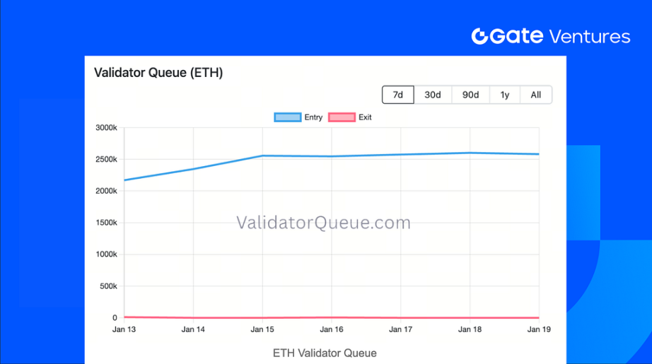 As of 19 Jan, the ETH validator exit queue fell to zero, while the entry queue continued to rise and remained around 2.6M, indicating strong staking demand alongside limited withdrawal pressure for ETH. (7)