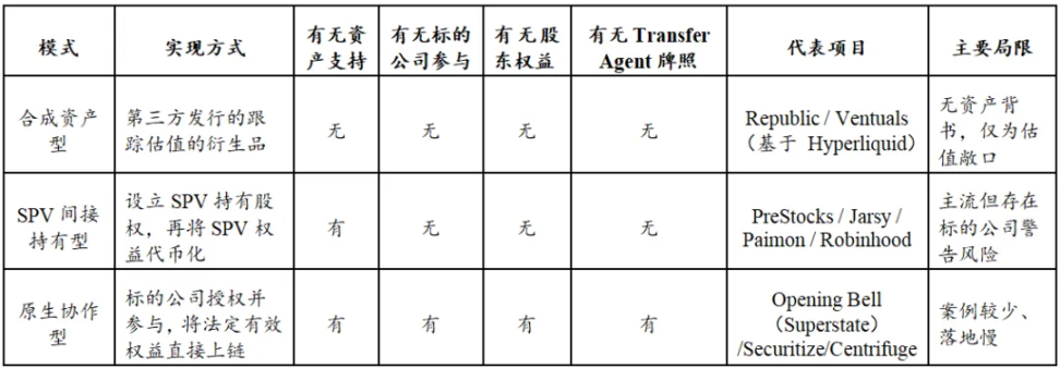 (1)合成资产型(衍生品):作为“流量入口”,利用高杠杆与低门槛优势捕捉投机性需求,完成早期的用户教育与流动性引入,但并不承载真实股权的资产化职能。