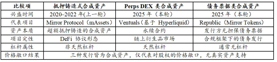 • 债务票据类合成资产:本质为平台发行的票据代币化,属于债权工具,以合同条款约定与标的表现挂钩,代表性项目为 Republic 的 Mirror Tokens。