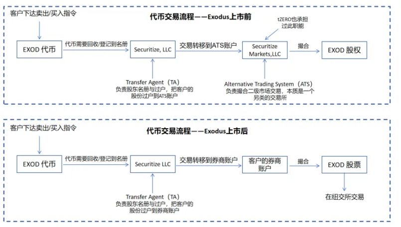 上图展示出上市前后不同阶段的流动性机制,可以发现在 Exodus 在上市前后的代币流动性核心都通过 Transfer Agent(TA)完成,但上市后可以实现代币和股票的相互转化。