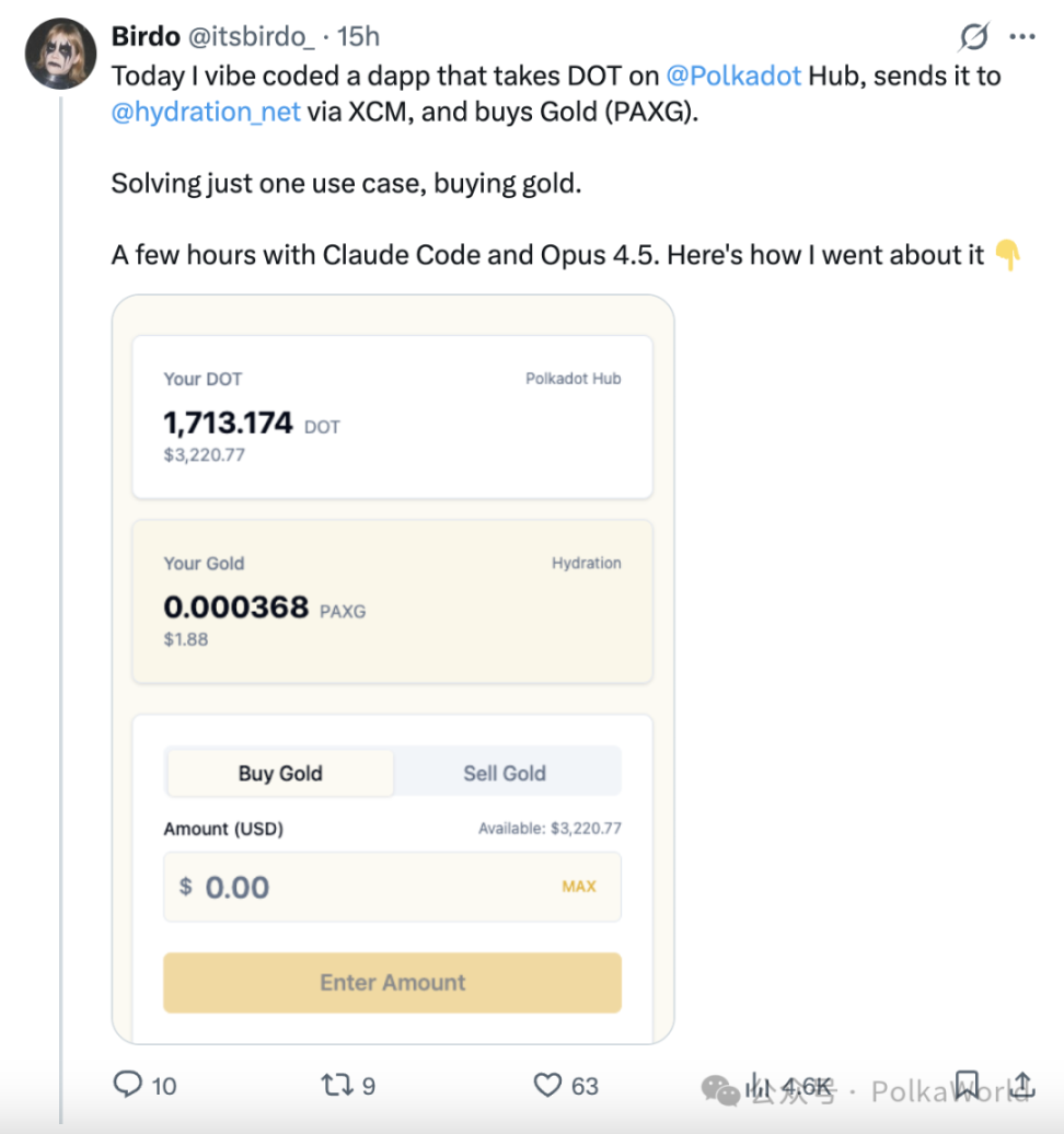 今天,社区中出现了一个非常直观的案例。一位 Parity 的开发者在短时间内构建了一个 dApp,实现了这样一件事:在 Polkadot Hub 上使用 DOT,通过 XCM 将资产发送到 Hydration,并在那里完成对 PAXG(代币化黄金)的兑换。