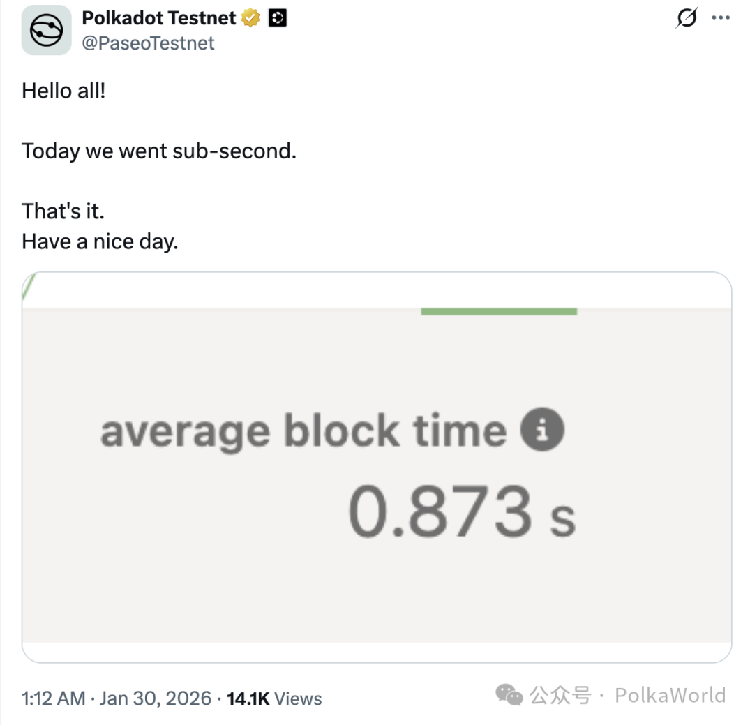 意味着 Polkadot 的测试网,已经正式进入亚秒级出块阶段。