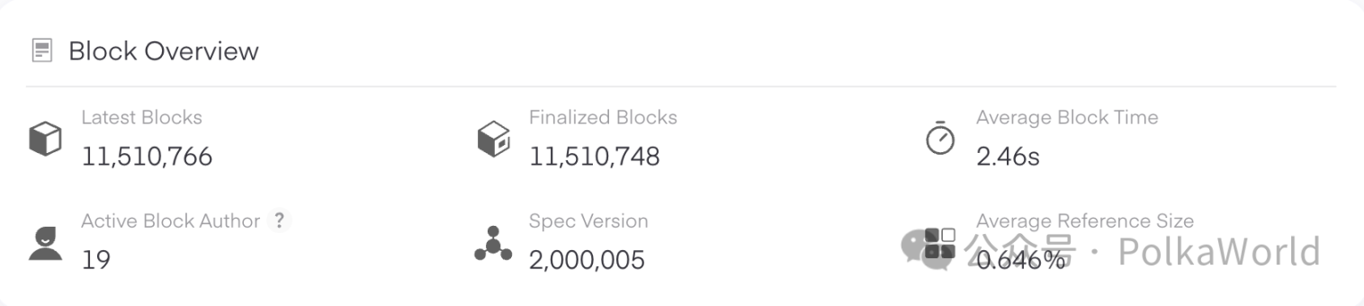与此同时,Polkadot Hub 也从原本的 6 秒出块,切换到 2 秒出块(目前显示平均出块时间在 2.46 秒)。