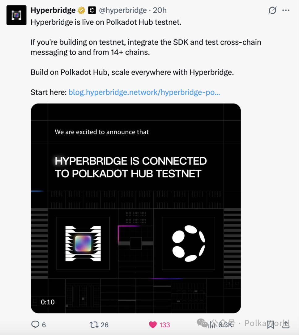 Hyperbridge 宣布他们已在 Polkadot Hub Testnet 上线,开发者现在可以通过集成 SDK,测试与 14+ 主流区块链之间的跨链消息传递与资产交互。这意味着,未来在 Polkadot Hub 上构建应用的同时,即可原生对接以太坊、Base、Arbitrum、Polygon、BNB Chain 等外部生态。