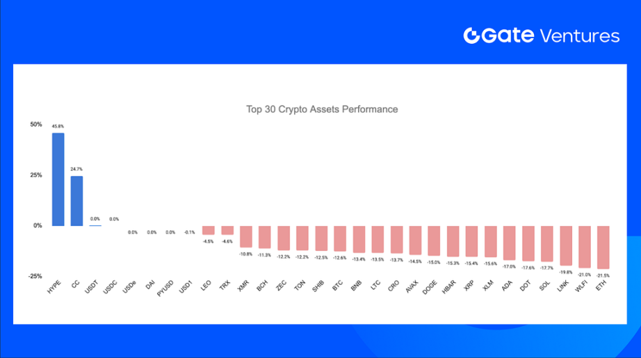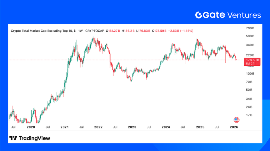 Total crypto market cap fell 11.3%. Excluding BTC and ETH, the market declined 8.1%, and altcoins outside the top 10 dropped 8.7%. This indicates that BTC and ETH are weakening more than the rest of the market.