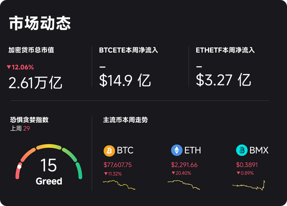 本周全球金融市场与加密资产同步承压,宏观不确定性与资金避险情绪主导市场走向,以下为核心要点总结: