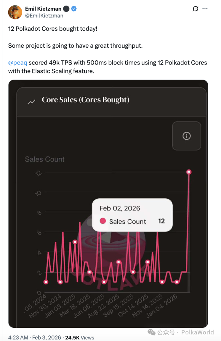 不过在最早的 spammening 测试中,Kusama 使用了 23 个 Core 曾达到约 143k TPS,所以 12 个 Core 的理论上限应该超过 75k TPS 才对,不过 peaq 在更真实执行条件下实现 49k TPS 也是不错的数据了!https://x.com/polkaworld_pro/status/2018588389142864270