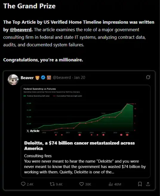2 月 4 日,X 公布了百万美元文章竞赛的获奖者,@beaverd 凭借「Deloitte, a $74 billion cancer metastasized across America(德勤,740 亿美元的美国癌症)」成为了最终的优胜者,获得了 100 万美元的奖励。