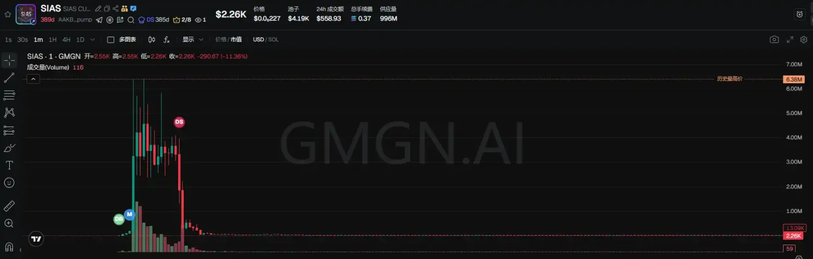 Bubblemaps 表示根据 Beaver 的公开 Solana 地址发现了关联地址「2mQB8o」,而该关联地址在 pump.fun 上发行了代币 $SIAS。$SIAS 在部署后的 7 分钟快速触及到了 600 万美元市值,然后又在接下来的 10 分钟后,因 dev 大额卖出而快速归零。