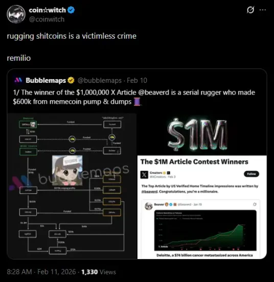 在英文圈,Beaver 也算是一个比较知名的 meme 币玩家,因此他的获奖让币圈感到振奋。但在前天,Bubblemaps 发表推文对他进行了指控,称他为一名「连环发盘手(serial rugger)」,通过操控币价获得了 60 万美元的利润。