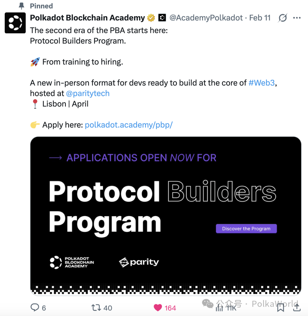 PBA 是由 Gavin Wood 发起的世界级教育项目,核心目标是培养下一代顶尖 Web3 工程师和协议级构建者。PBA 的课程和资源覆盖了区块链底层的基础理论、实践细节和未来技术方向,真正帮助学习者从理论走向实战,从兴趣走向职业。最新推出的 Protocol Builders Program 则代表了 Academy 进入新阶段的坚定步伐——它不仅仅是课程,更是一条迈向职业化发展的路径。