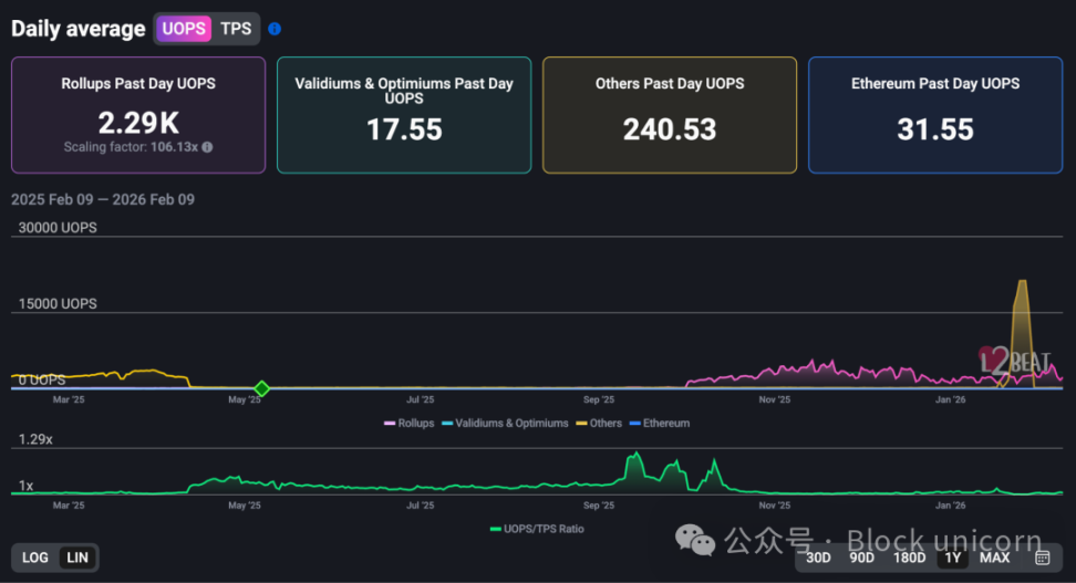 用户活动也呈现同样的模式。过去一天,Rollup 的平均每秒操作次数为 2290 次,是以太坊每秒 31.55 次操作的 106 倍。但这种活动非常集中,Base 和 Arbitrum 占据主导地位,长尾交易几乎可以忽略不计。