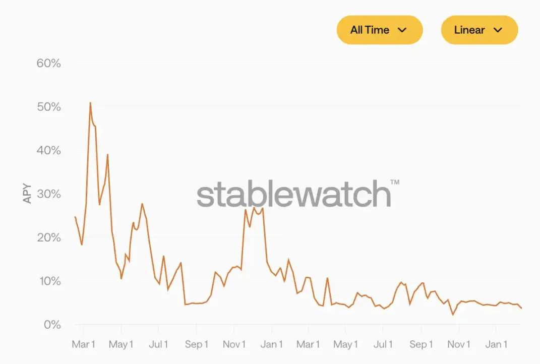 二是长时间的正资金费率带来的期现套利空间,这部分收益则被 Ethena 等项目和机构瓜分殆尽,sUSDe 的 APY 如今跌到了 4% 以下,作为对比,2024 年初这个数字一度超过 40%;