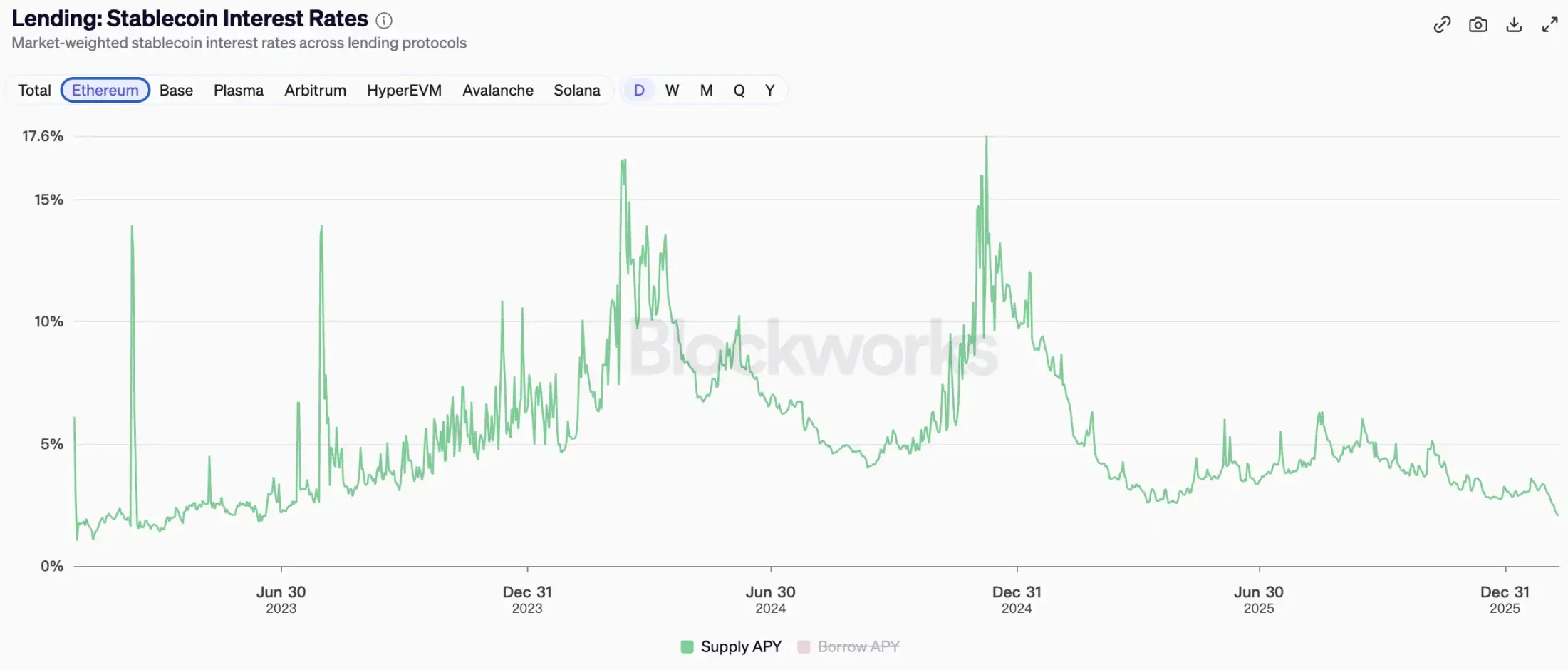 三是真实的借贷需求。熊市中交易者对链上资产的敞口需求萎缩,利率也跟着一泻千里。稳定币贷款利率如今已经跌回 2.3%,是近几年来的新低。