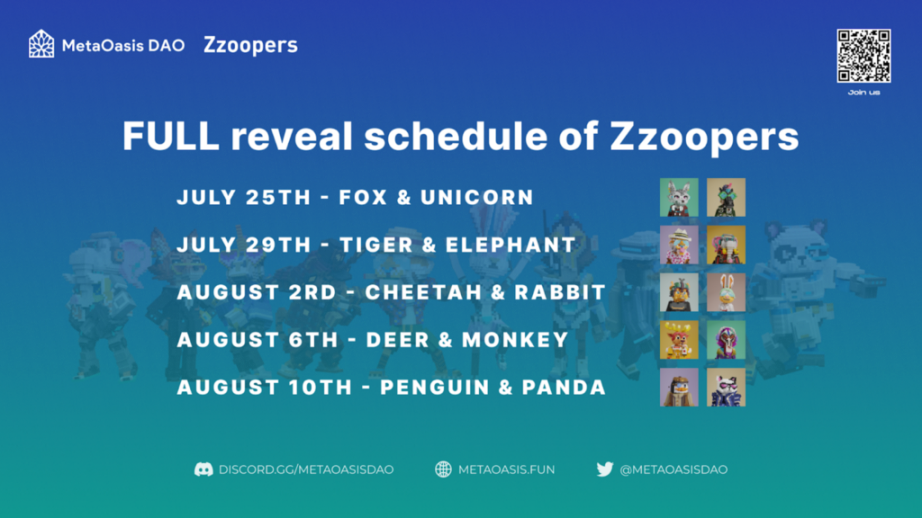 We are working hard on the upcoming reveal of Zzoopers Genesis. There are 5 rounds in total to reveal Zzoopers Genesis. At each round of reveal, 2 out of the 10 animal characters will go live. You can choose to claim, or wait. Better be hurried when it’s your favorite character’s turn. The redemption of Zzoopers Genesis will begin on July 25th.