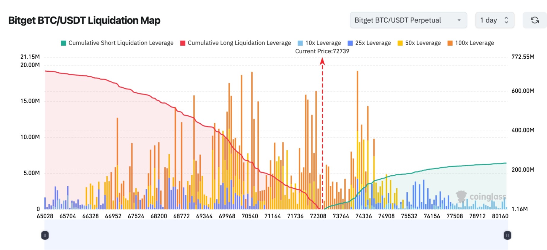 Bitget BTC/USDT 清算地图:当前价格约 72,739,下方 70,000–72,000 区间存在密集多头清算区,一旦回落可能触发连环多单清算。上方 74,000–75,000 附近空头清算压力较集中,若价格上冲,可能引发空头挤压(short squeeze)。