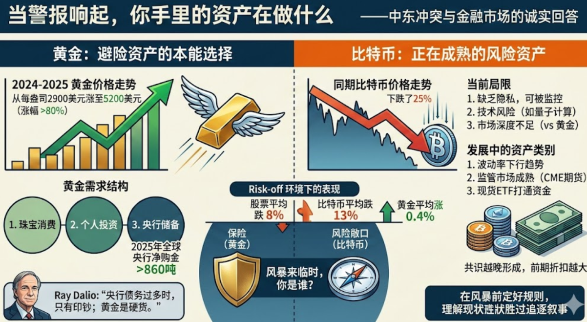 中东的战争还没有停。警报响起的那一刻,金融市场给出了它最诚实的回答——不是对战争走向的预测,而是对"谁是保险"这个问题的本能判断。