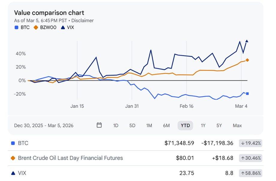 2026 年初以来,原油与 VIX 呈现高度的正相关性,目前两者同步上涨,意味着能源价格飙升正在直接驱动市场的恐慌情绪。而被视为“数字黄金”的 BTC 价格与 VIX 呈现明显的负相关,即市场越恐慌,比特币抛压越大。其背后原因就是原油上涨带来的通胀压力强化了高利率预期,这对高风险资产(比特币)和股市(通过 VIX 表现)构成了双重打击。