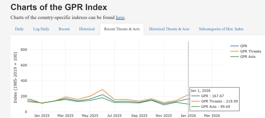 地缘政治风险指数是一个衡量全球地缘政治风险变化的指标,通常用于评估国家或地区因政治不稳定、冲突、战争、政策变动等因素对经济和市场的潜在影响。更重要的是,这套体系把风险拆成两个更“交易化”的部分: