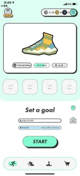 STEPN 的玩法大概是这样的,玩家需要购买跑鞋作为入场券,然后只需轻点界面的“Start”,便可开始游戏,入口很像 WEB2 的大多数小而美的应用。