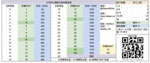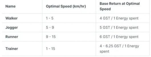 跑鞋包括 4 个品种,分别为 Walker、Sneaker、Jogger 和 Trainer,起始等级是 0 级,单个鞋子的能量上限是 2,收藏级的绿鞋是 3,紫鞋是 4;鞋子种类不同,跑步 / 行走的速度上限也有所差异;每日赚取的 $GST 初始上限是 5,能量上限可以依靠购买鞋子来提升,玩赚上限可以依靠升级来提升。以下是白皮书中关于鞋子种类和基本回报的对照表