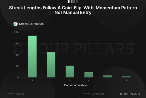 最长连续上涨或下跌为 6 天,平均连续长度 1.92 天,符合具有适度动量的自然过程预期。连续长度分布呈几何级数递减:185 次单日连续、111 次两日连续、52 次三日连续,直至 7 次六日连续。