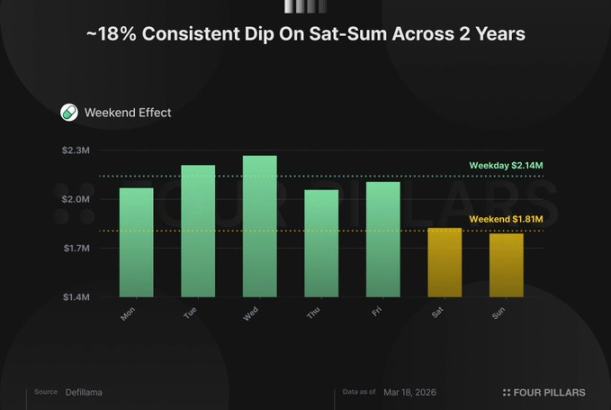 再次检验周末效应。Pump.fun 为散户平台,用户多在交易日而非周末发行代币。工作日日均费用 214 万美元,周末 181 万美元,持续约 18% 的降幅,在两年数据中周复一周显现。Mann-Whitney 检验显示 p 值为 0.003,具统计显著性。若人为构造数据,需刻意使周末持续偏低,这增加了造假的复杂度和被识破风险。
