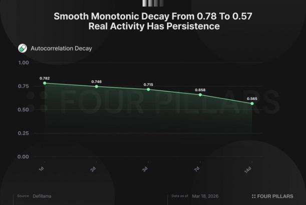 最后检验自相关性,衡量今日收入与明日收入的关联度。Pump.fun 一阶滞后自相关性为 0.78,表明今日费用与昨日有 78% 相关;一周后(滞后 7 天)仍达 0.65;两周后(滞后 14 天)为 0.57。这种缓慢平滑衰减反映了有机平台活动的动量特征:活跃时间聚集,低迷期延续。若随机生成每日收入,相邻日期间相关性近乎为零,数据将如噪声般跳跃而非如市场般流动。伪造单一滞后的高自相关性不难,但需同时伪造整个衰减结构(各滞后逐步单调下降),并保持周末效应、连续特征及真实数字分布,则几乎不可能。