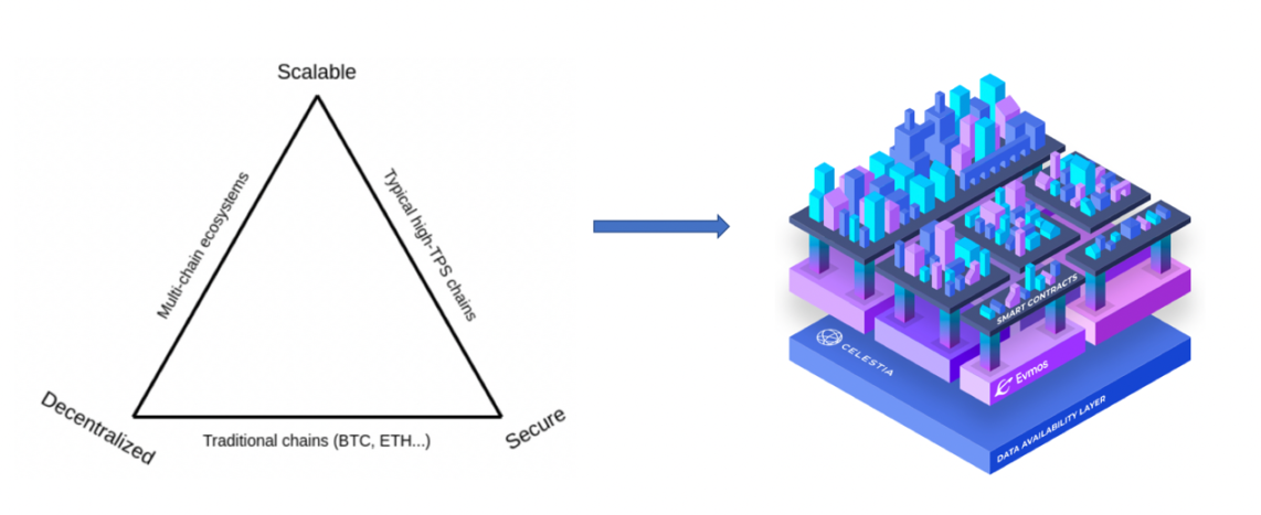 Celestia 正在与 Evmos 合作推出 Cevmos。Cevmos 是一个开源的模块化堆栈,使用 Celestia 作为数据可用性层,为基于 EVM 的应用构建在 Celestia rollup 上提供基础,进而使基于 EVM 的高效 rollup 能够在 Cosmos 枢纽中运行,并具有更高的可扩展性和安全性。