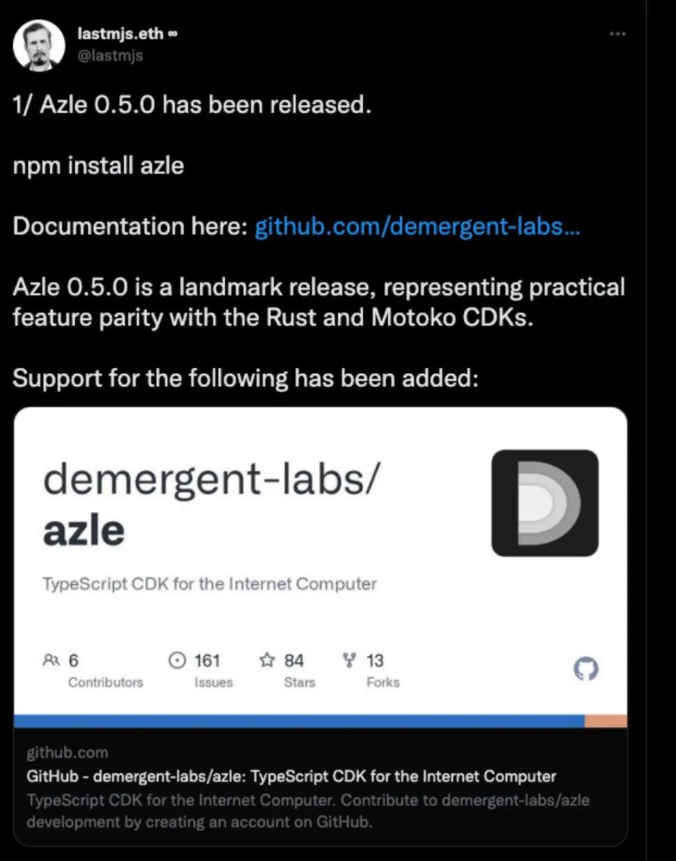 据官方本次发布的信息表示,Azle 0.5.0 是一个具有里程碑意义的版本,代表了 Rust 和 Motoko CDK 的同等的实用功能。