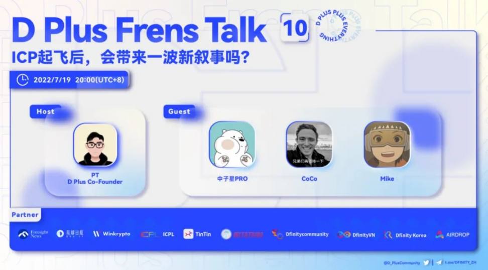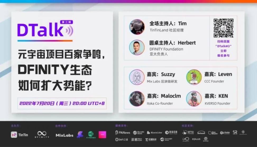 7 月 20 日:TinTin 举办第三期 DTalk- 元宇宙项目百家争鸣,DFINITY 生态如何扩展势能