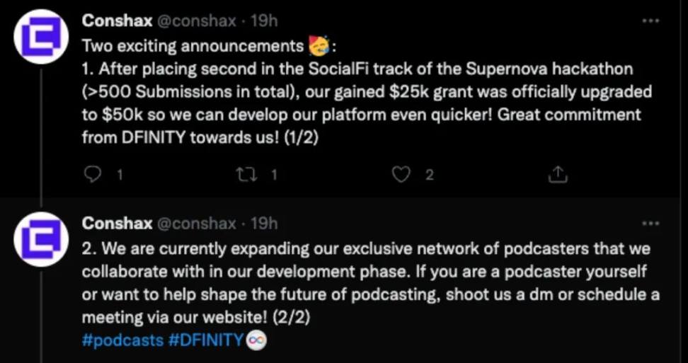 Conshax 是一个通过集成 Podcasting 2.0 协议,并启用 DFINITY 的 Web3 原生链上托管的博客平台,据官方此次发布的信息表示,此前在 SocialFi 赛道获得名次的 Grant 金额从 2.5 万美元提升至 5 万美元。
