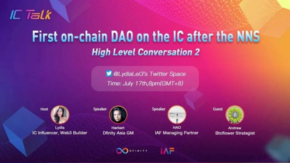 7 月 15 日:Lydia 与 Herbert/DFINITY 亚洲区 GM、HAO/IAF 管理合伙人以及 Andrew/BTCFlower 策略师举办第二期 IC Talk- 继 NNS 后的链上治理 DAO-Flower DAO