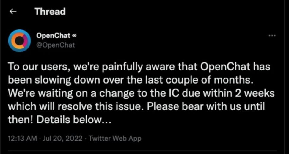 OpenChat 是一个建立在 IC 上的即时社交平台,功能类似于 WhatsApp,此前版本支持在 App 中发送 ICP Tokne 和 ICP Token 群红包,根据官方此次发布的信息表示,近期由于 OpenChat Canister 托管子网上托管 Canister 的数量和完成率下降,导致请求响应延迟较长,目前正等待 DFINITY 实行解决方案,预计会在 2 周内完成。此外,OpenChat 还表示 IC 在接下来即将推出的 Canister 调用功能(HTTP 请求和响应标头)将能够使他们利用 HTTP 缓存,大大加快 OpenChat 的加载速度。