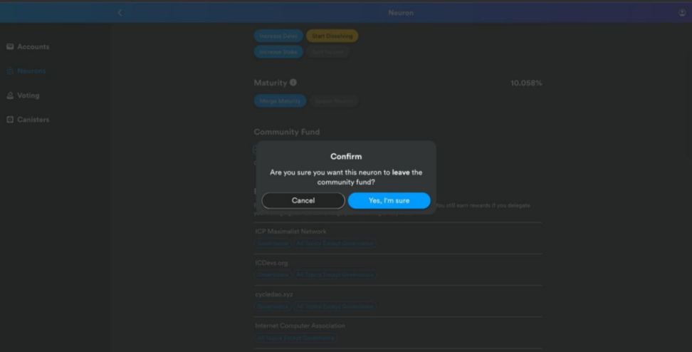 在 NNS 前端 Dapp 中,有一个社区基金 /Community Fund 功能(还未正式上线),在正式版上线后,神经元持有者可以通过该按钮计入社区基金,并将投票利息投资生态项目。在此次功能更新后,此前误加入社区基金的神经元小伙伴们可以自由退出了,在正式版功能上线前都能退出。
