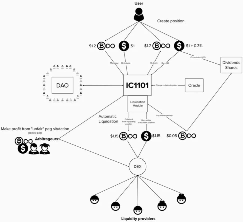 IUSD 是一个建立在 IC 上的超抵押稳定币协议,基于 BTC 和 ICP 实现,在官方本次发布的文章中详细概述了 IUSD 的运作逻辑,需要注意的是文章中概述的超额抵押率和清算罚款参数仅作为示例描述。