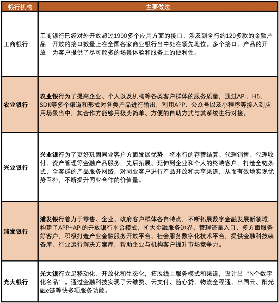 开放银行可以定性为商业银行场景金融初级阶段形态,前者通常做法是对商业银行的业务接口对外开放,立足于技术层面,而后者是立足于商业银行与客户金融交易的全过程、全景象,不仅包含技术,更关注客户方的体验 场景金融比开放银行的概念内涵更加丰富、范围更加广泛、管理更加系统、服务更加人性化,场景金融是开放银行最终存在形态。目前,各家商业银行推出的所谓场景金融实质上都属于开放银行这一层次和范畴,但是元宇宙的基因与理念在开放银行中也已得到充分的体现。(见表:元宇宙基因或理念嵌入国内部分商业银行开放银行情况表)。